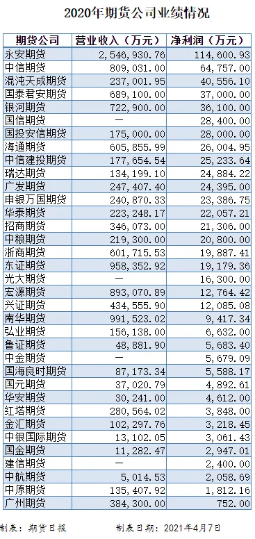 近期,上市公司和新三板挂牌公司年报密集披露。据期货日报记者统计,截至4月7日,有35家期货公司去年业绩出炉。期货日报记者梳理后发现,2020年,构成期货公司主要收入来源的四大业务板块中,除投资咨询业务收入有所下滑外,经纪业务、资产管理业务、风险管理业务收入均呈现良好的增长势头,期货公司业绩普遍表现靓丽,多家期货公司业绩创出历史最好成绩,在记者统计的35家期货公司中,净利润1亿元以上的公司共有20家,永安期货以254.69亿元的营业收入、11.46亿元的净利润稳居行业“一哥”位置。